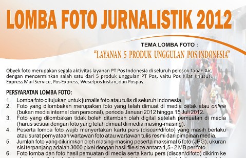 PT. Pos Indonesia bekerja sama dengan Bandungnewsphoto tengah mengadakan “Lomba Foto Jurnalistik 2012” untuk para jurnalis yang mengangkat tema “LAYANAN 5 PRODUK UNGGULAN POS INDONESIA”. Obyek foto merupakan segala aktivitas layanan PT Pos Indonesia di seluruh pelosok Tanah Air, dengan mencerminkan salah satu dari 5 produk unggulan PT Pos, yaitu Pos Kilat Khusus, Express Mail […]